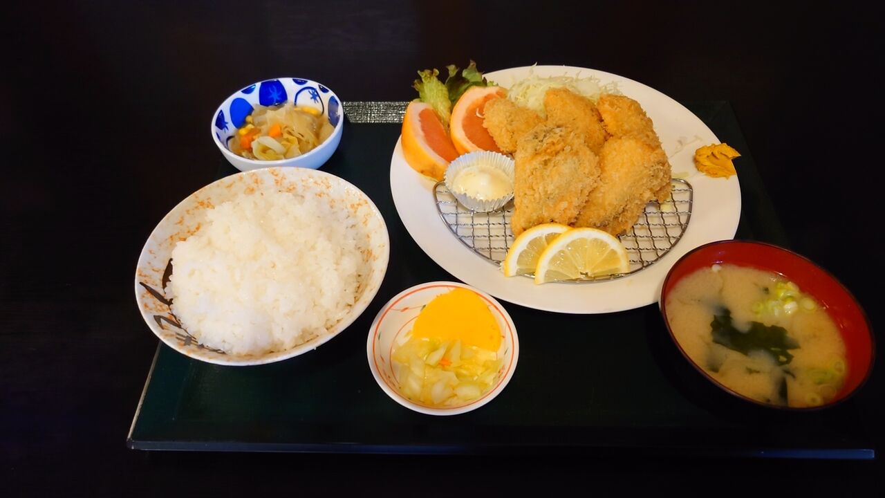 遅お昼は鹿曲さんで旨旨ジューシーの牡蠣フライ定食をいただきまして😊